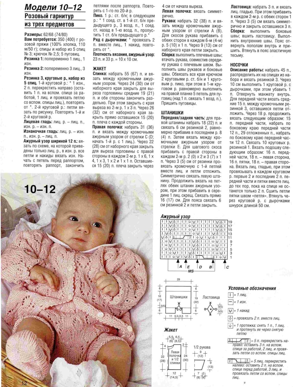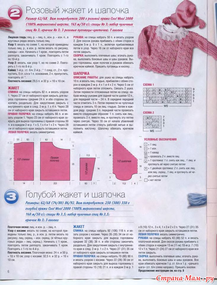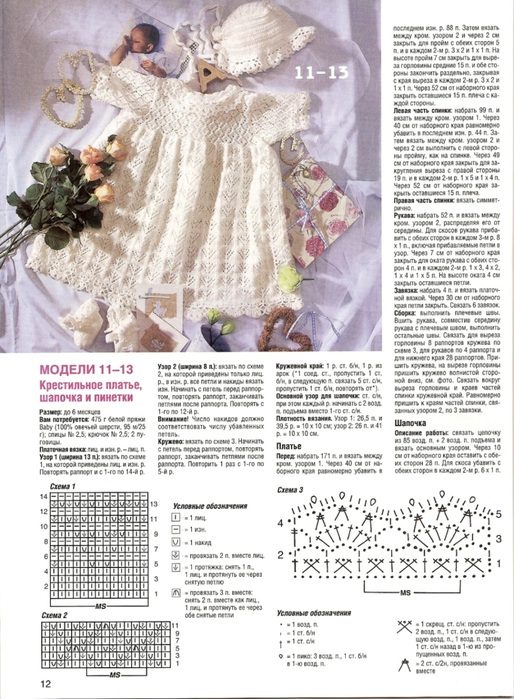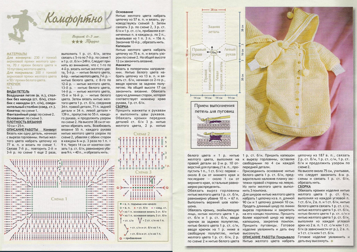 Возобновляем работу на 50 п. каждого из рукавов по схеме 1, создавая 5 рапп. = 60 п. После связанных 12 см от кокетки, завершаем работу.