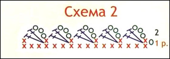 - 2 р.: 1 с. с н. в 1-й с. с н. нижнего р., *1 с. с н. за в. п. нижнего р., 3 в. п.*, от * до *, заканчиваем 1 с. с н. в крайний с. с н. нижнего р.