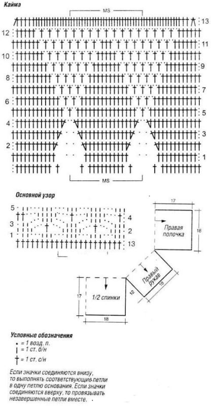 Кайма: вяжется по схеме (указаны лицев. и изнаночн. рр.). Повторяем петельки раппорта: 1 х 1-13 рр.