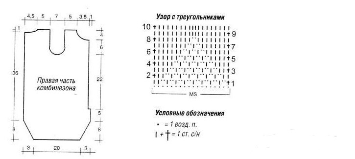 Сшиваем плечи и штанины, выполняем шов посередине спинки. Вертикальные края шлицы обвязываем 6 р. с. без н., при этом по произвольно выбранной планке равном. приб. 6 дырочек для пуговок.