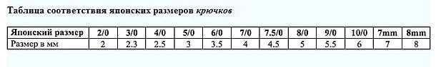 Начнем с соответствия японских крючков. В этом нам поможет таблица.