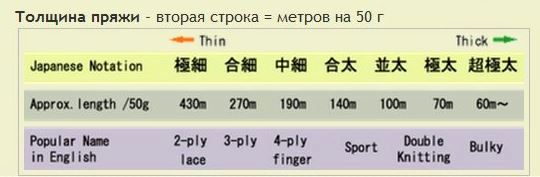 Теперь разберемся с пряжей. Во 2-ой строке таблицы приведена длина 50г ниток. В 1-ой – как эта информация выглядит по-японски.