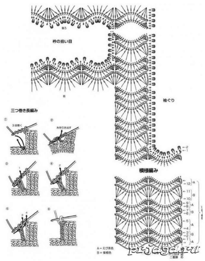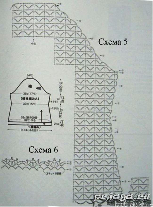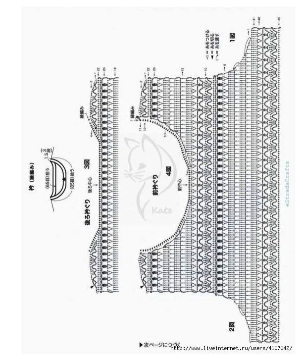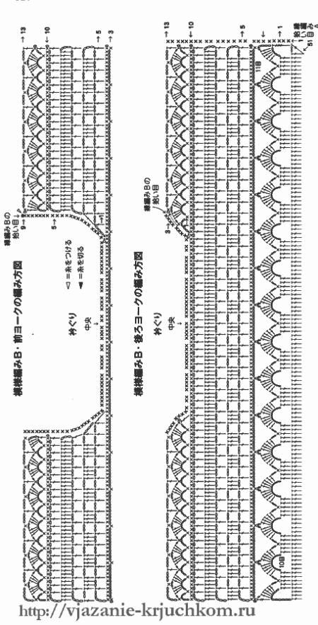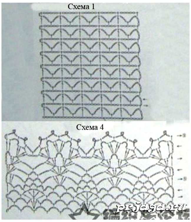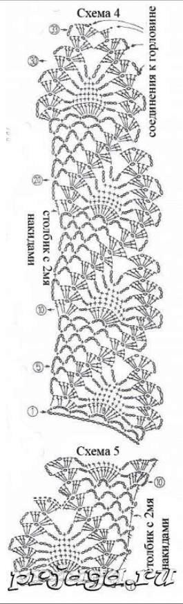 Выполняем плечевые и боковые швы. Подсоединяем нитку к нижнему краю правой половинки переда, вывязываем по периметру всего изделия арки по сх. No3. Продолжаем по сх. No4.