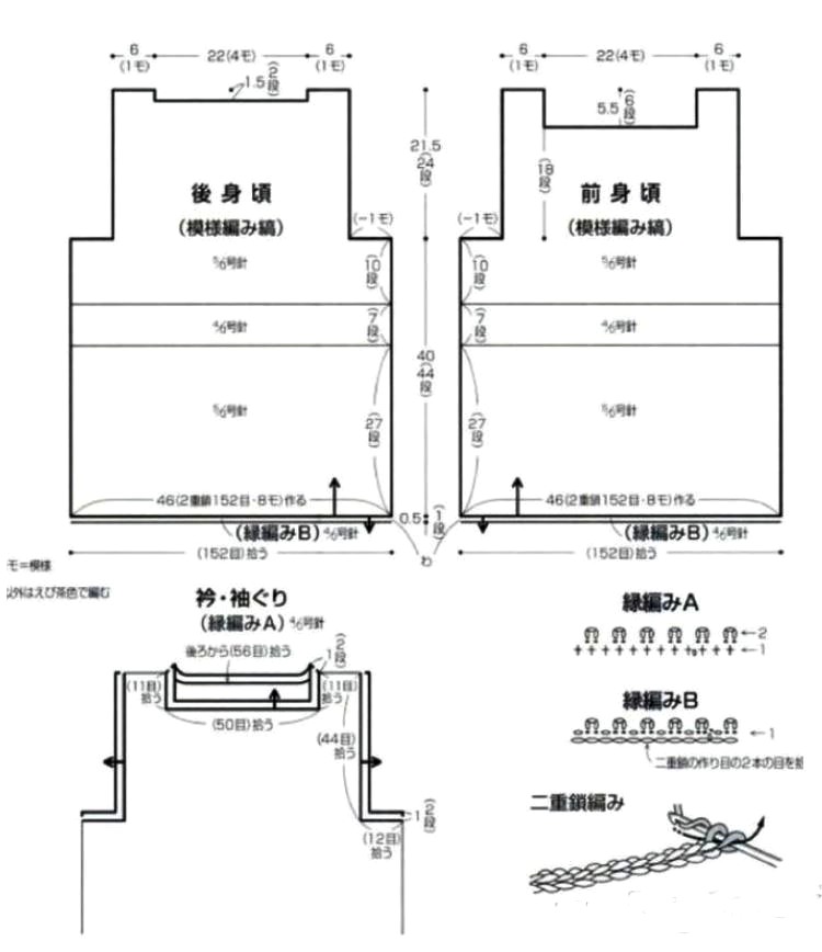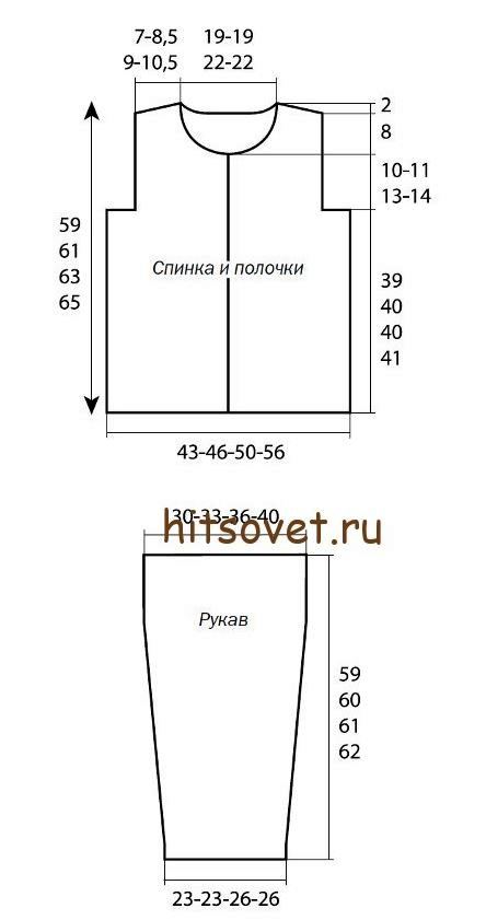 Для оформления пройм делаем убавления и прибавления по сх. No2. На ней же показано выполнение выката и плечевых скосов. На уровне 54см завершаем работу.