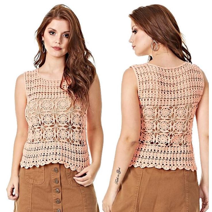Выполняем плечевые и боковые швы. Выкат, проймы, низ изделия обвязываем вкруговую стлб с пико: *1 СтБН в след-щую птл, 3 ВП, ССт в посл-ний вывязанный СтБН*. Участок *-* повторяем на весь ряд.