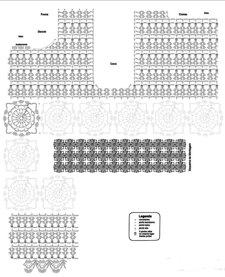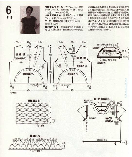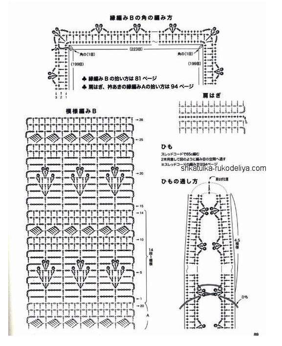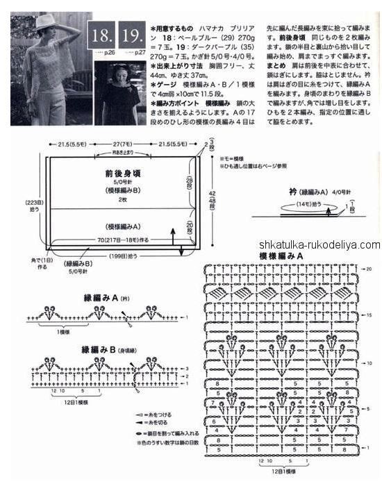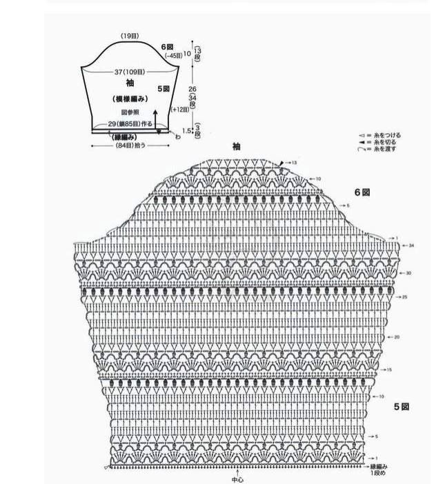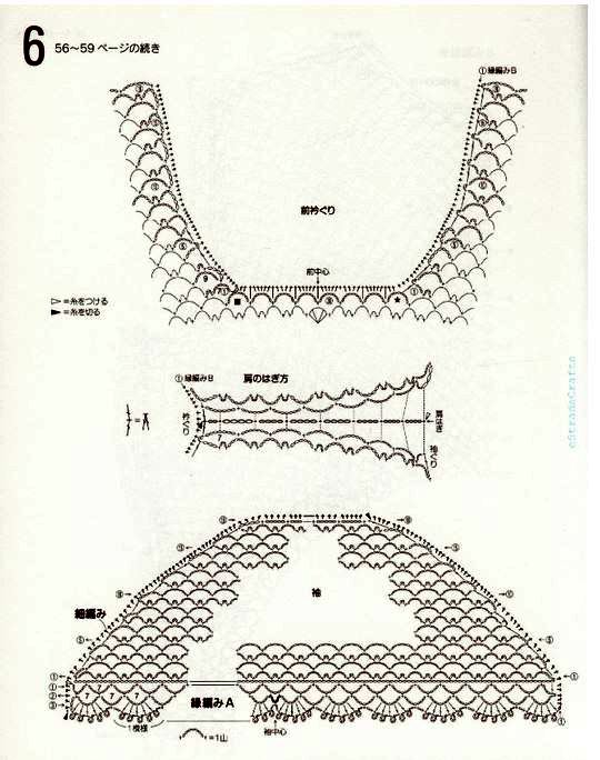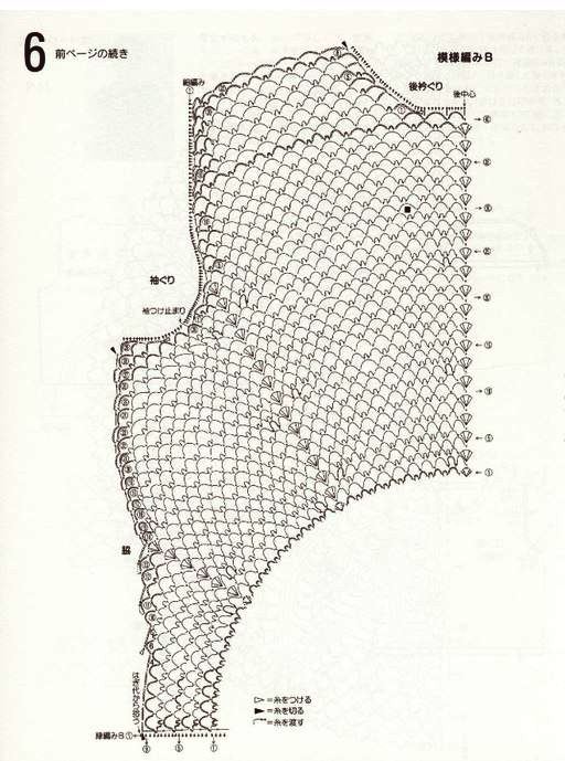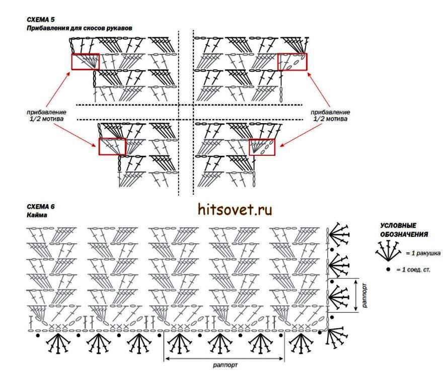 Выполнить 36 мотивов по сх. Соединить их в общее полотно 3 мотива х 6 мотивов. Затем обвязать низ изделия, горловину и проймы по схеме вееров. На схемке показаны разрезы проймы и выката. В завершение обвязываем выкат СБН, выполняя 2р.