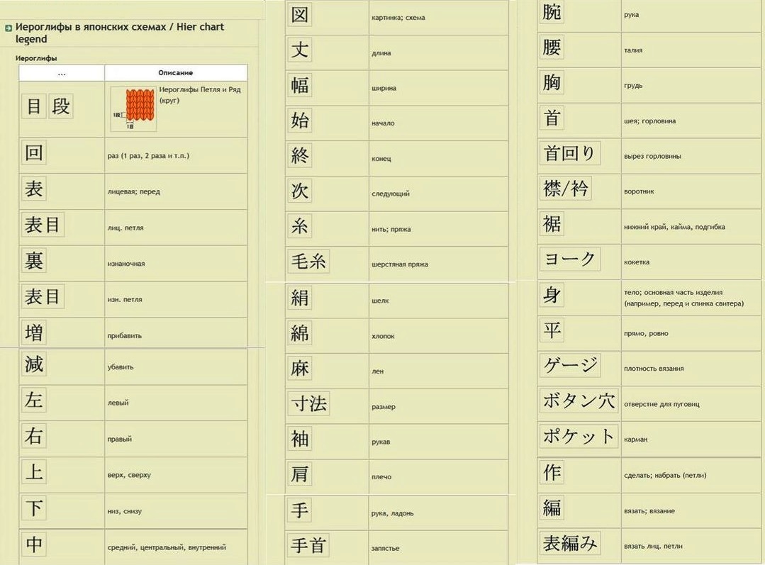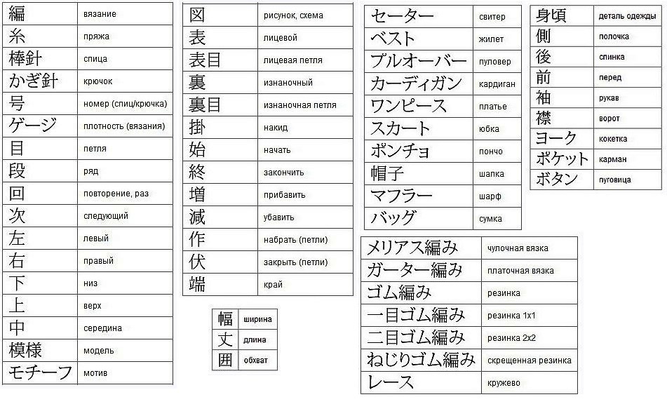 Для более свободного ориентирования по теме – см. таблицу с переводом основных терминов. Таблицы включают терминологию не только для вязки крючком, но и для вязания спицами по японским схемам.