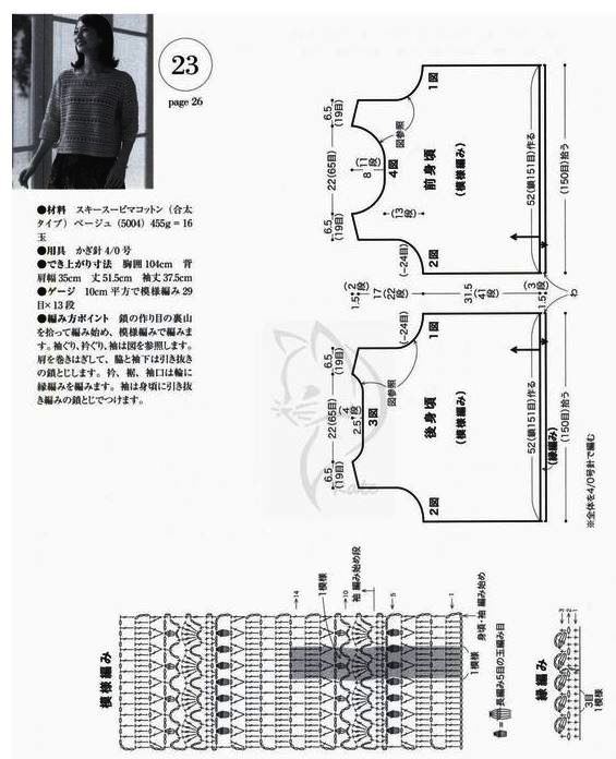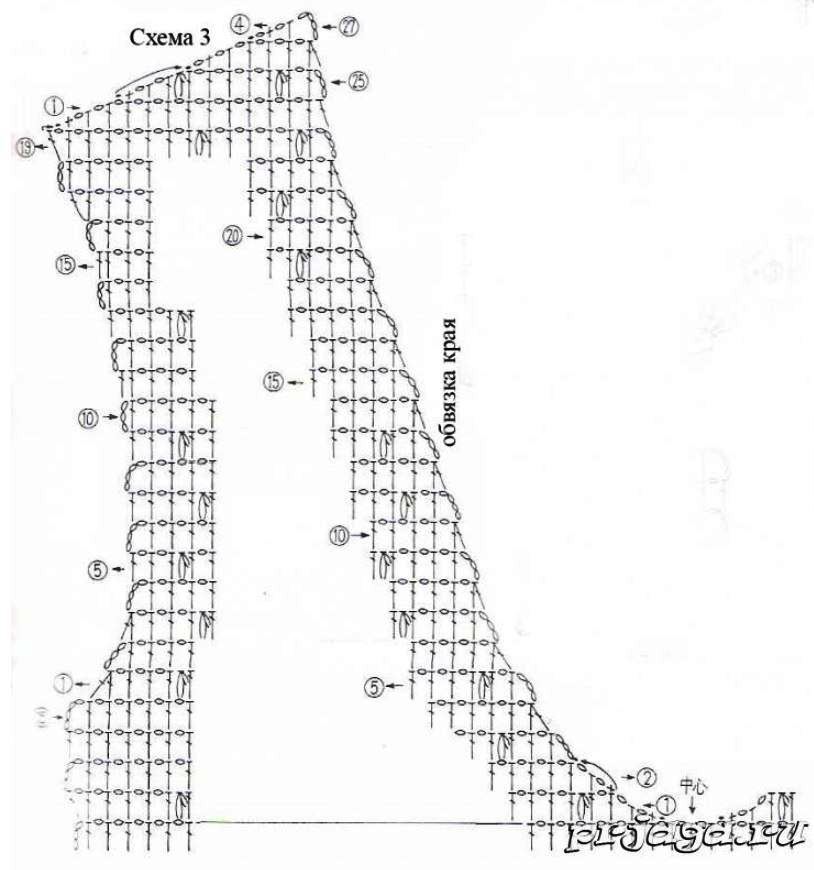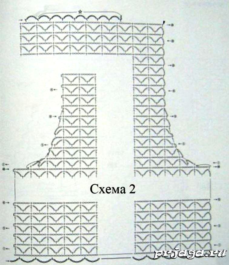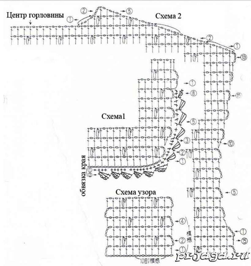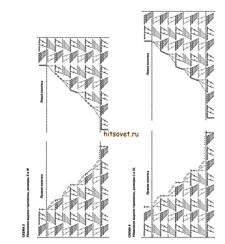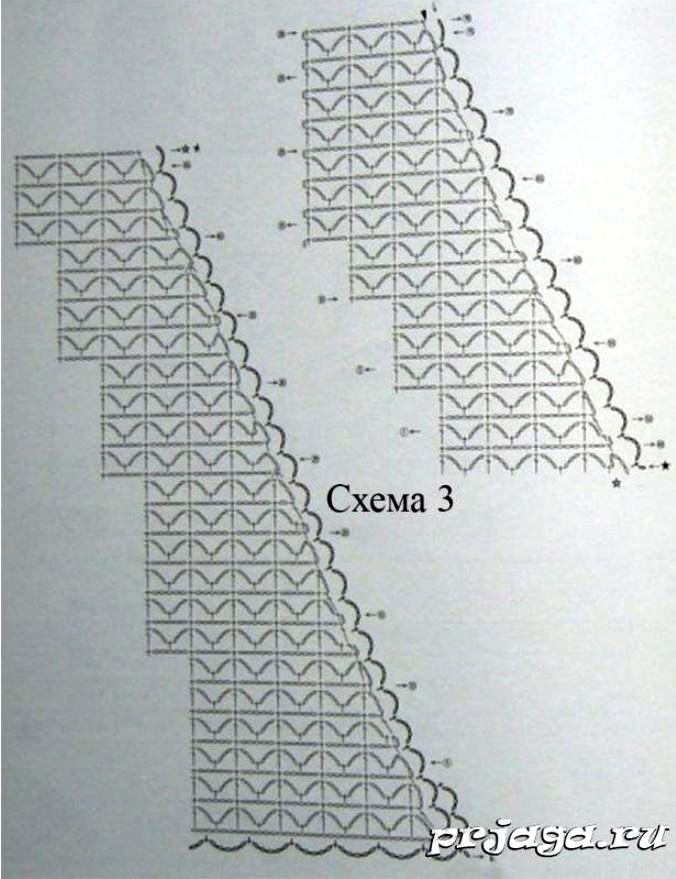 Набираем цепочку из 100 ВП (=33см). Вяжем сх. No1, выполняя убавки от серединки по сх. No3. Провязав 31см, делаем убавки на проймы, повторяя алгоритм для спинки. На уровне 50см завершаем работу. Мы получили плечо длиной 6см. Вторую половинку переда выполняем аналогично.