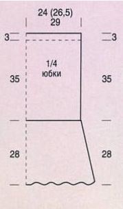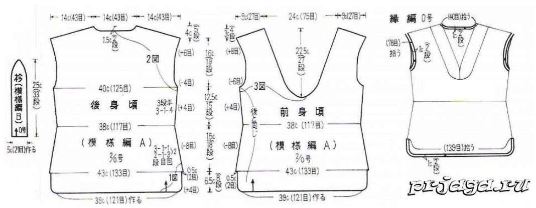 На уровне 31см делаем убавки по сх. No2 для оформления пройм. Провязав еще 19см, завершаем работу.