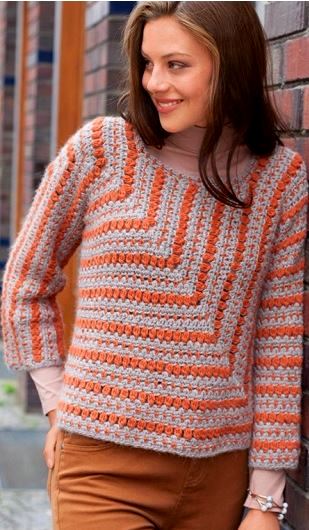 Сшиваем плечи, вшиваем рукава. Выполняем рукавные швы и швы на боках. Края изделия обвязываем 1р. каймы – сх. 6.