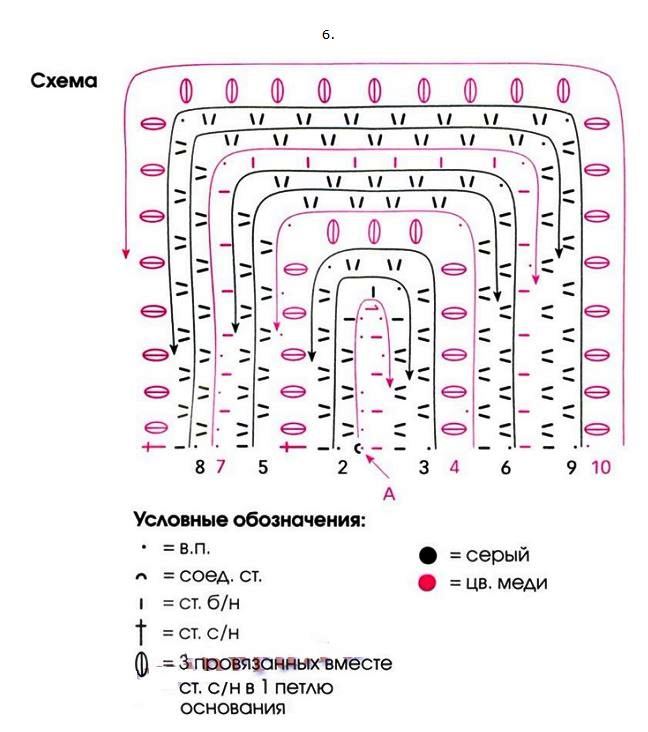 Набираем цепочку из 109 ВП (=38см). Выполняем сх. No1, делая убавки и прибавления по сх. No5. На уровне 38см завершаем работу.