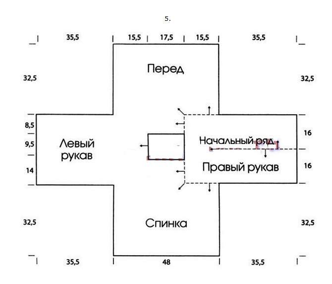 Начинаем с изготовления правого рукава без плечевого шва (первый р. – центральная линия рукава). После этого вяжем спинку и перед, завершаем вязание работой над левым рукавом. Направление вязания показано стрелками на выкройке.