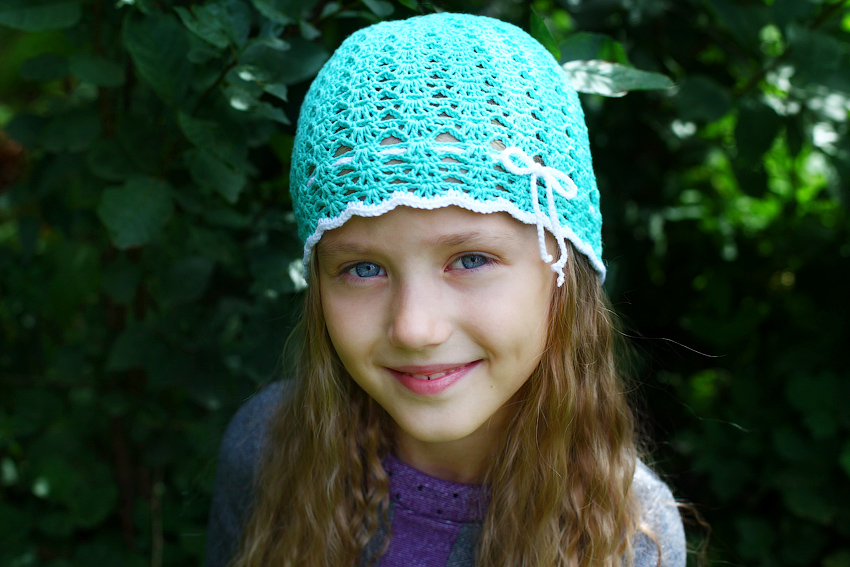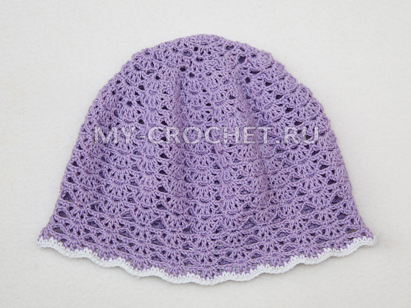 Наша панамка крючком для девочки готова! При желании, ее можно еще и украсить с помощью атласной ленточки или цепочки из воздушных петелек: проденьте декор в дырочки на узоре, украсьте кончики шнурочка бусинками и завяжите простой бантик.