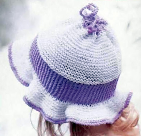 Спицами № 3,5 набираем 13 п. и провязываем их платочным вязанием на высоту в 40 см. После этого набираем белой ниткой по краешку полоски петельки, прибавляя по одной через каждые 5 п. Вяжем далее платочным вязанием еще 34 р. и закрываем все п. одновременно.