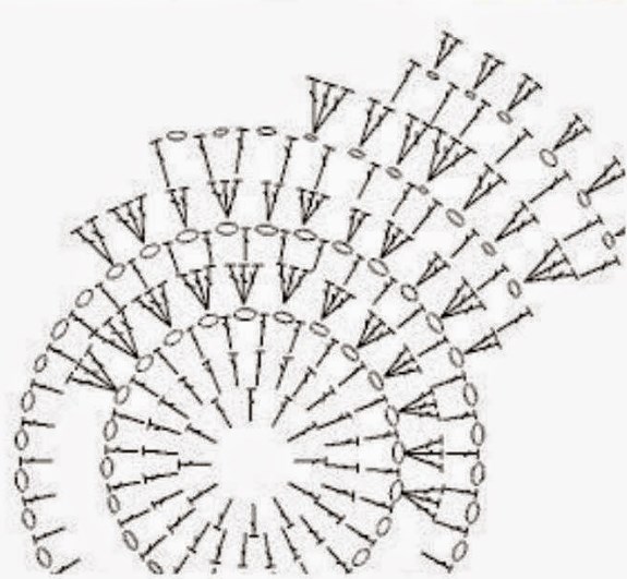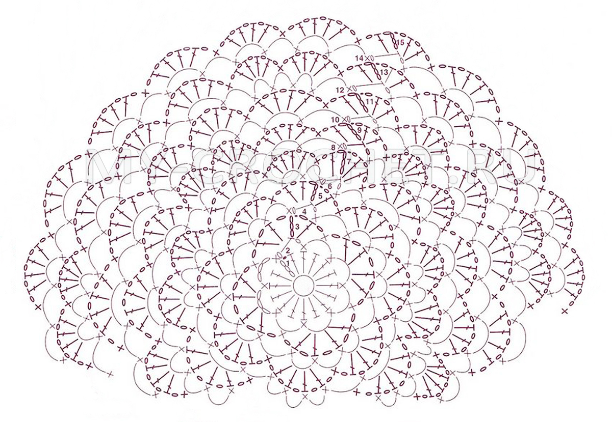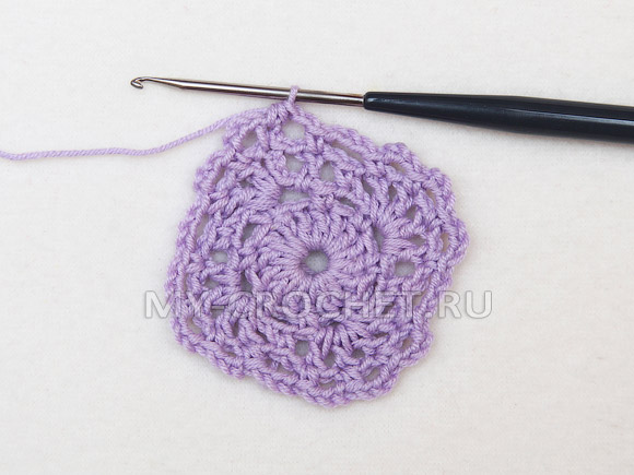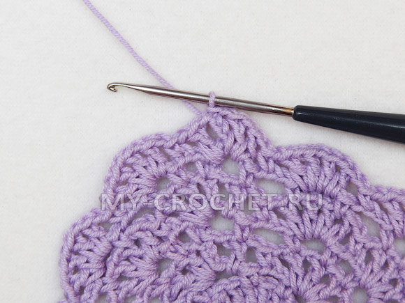 28 р.: 1 в. п. п. и 1 с. без н. между цепью из в. п. предыдущ. р. и след. с. с н., 3 в. п., *с. без н. между 1 и 2 с. с н. предыдущ. р., 2 в. п. и с. без н. между 2 и 3 с. с н., 3 в. п.*, от * до * до конца р., с. без н. в 1-м элементе, 1 в. п. и замыкаем р. полуст. с н. в 1-й с. без н. этого р..