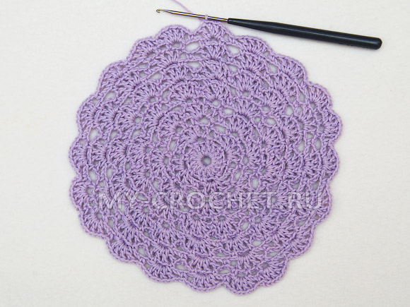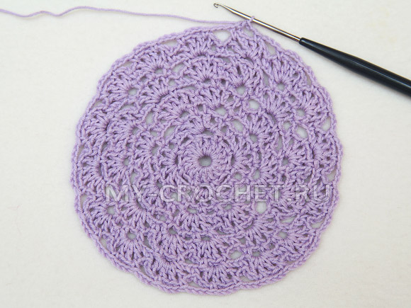 Продолжаем обвязку с. без н. (еще один рядок), продолжая вводить крючок не в петельки только что провязанного ряда, а в центр колечка. Обрезаем, закрепляем и прячем ниточку.