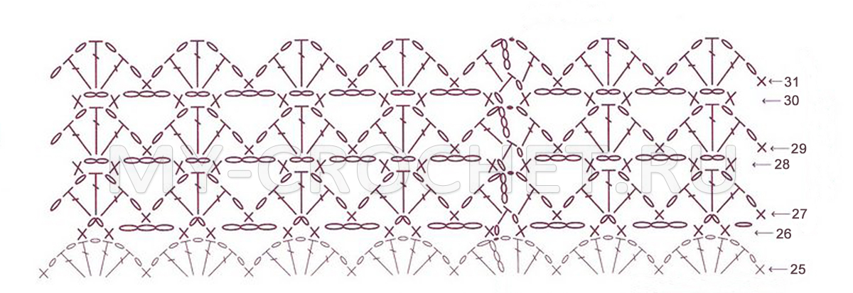 27 р.: 4 в. п. и с. с н. в эту же арку, 1 в. п., в центральную п. след. арки вяж. с. без н. и 1 в. п., *в след. арочку из 2 в. п. предыд. р. выполняем с. с н., 1 в. п., с. с н., 1 в. п., с. с н. и 1 в. п., в центральн. п. след. арочки мы вяж. с. без н. и 1 в. п.*, от * до * до конца р..