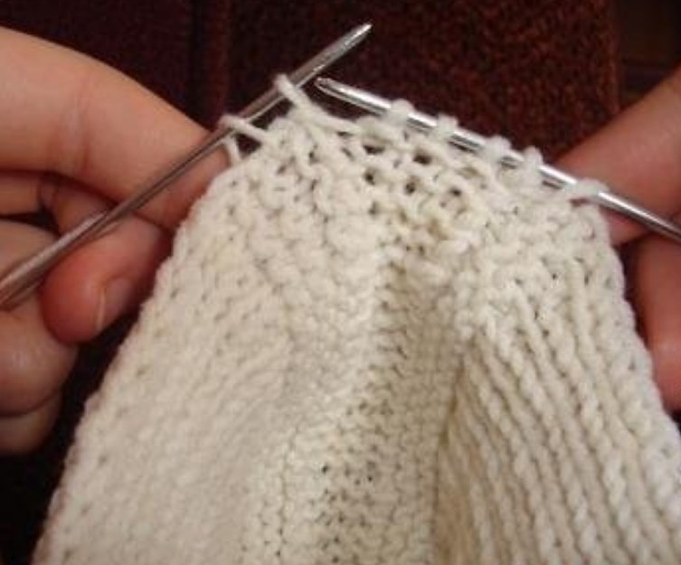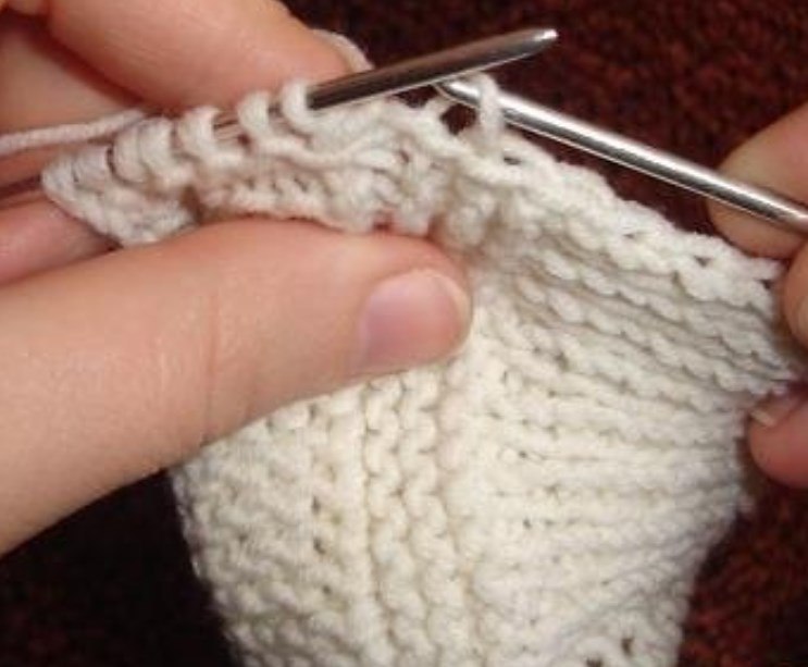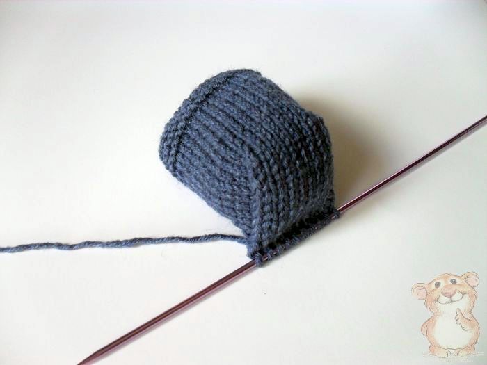 После этого вяжем 13 оставшихся петелек резиночкой 1 х 1, одновременно поднимаем по одной крайней боковой петельке и провязываем ее вместе с последней петелькой текущего рядка (лиц. р. – лиц. п., изн. р. – изн. п.).