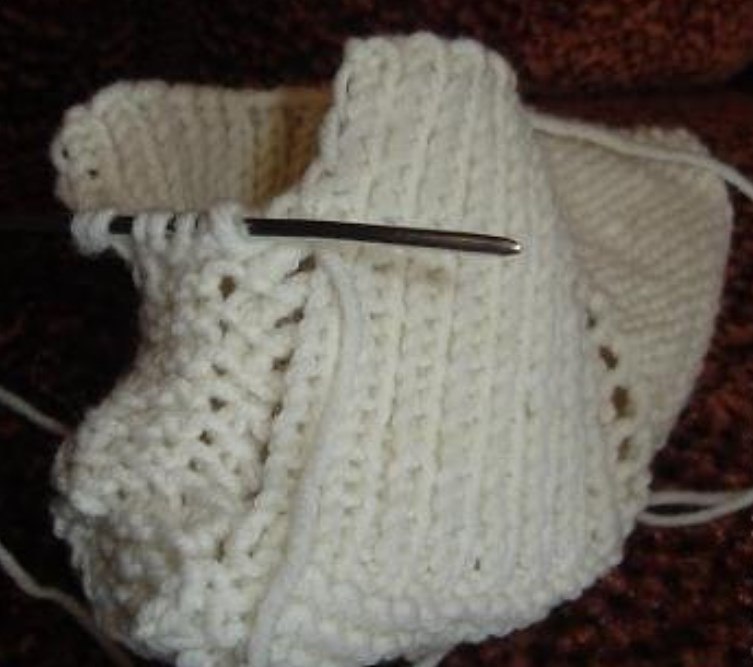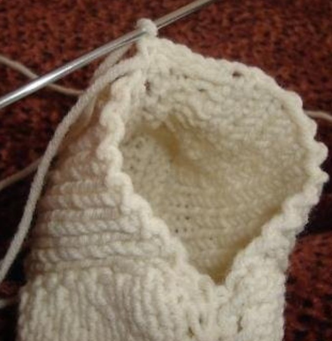 На рабочую спицу нам нужно набрать 10 п. с боковой части пяточки. Поворачиваем вязание, вяжем 20 п. и набир. 10 п. с другой части пятки. У нас должно быть 30 п. на спице.