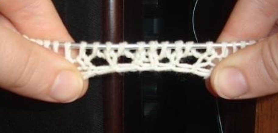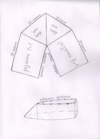 - 1 р.: 1 кромочная (кр.) п., 23 п. резиночка 1 х1, накид (нак.), 1 л. п., нак., 1 л. п., нак., 1 л. п., нак., 23 п. резиночкой 1 х1, 1 кр. п.