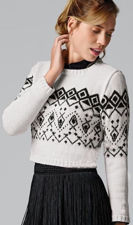 Одновременно через 28,5см (104р.) от начала детали провязываем 20см (63р.) жаккардовым узором, располагая петлю Х схемы по центру рукава, затем продолжаем лицевой гладью белыми нитками на всех петельках.