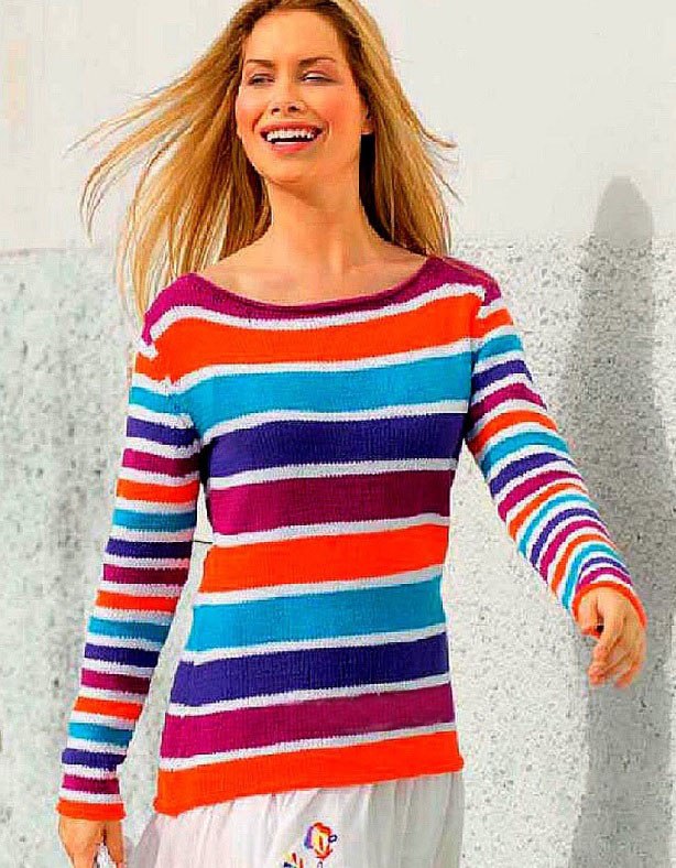 Начинаем вязать модный джемперок морковной пряжей. Набираем 103; 113; 123п. и выполняем 3р. платочным рис-м, при этом 1-ый р. должен быть изнаночным. Продолжаем полотно лицевой гладью, чередуя большие и маленькие цветные полосы по описанию выше.