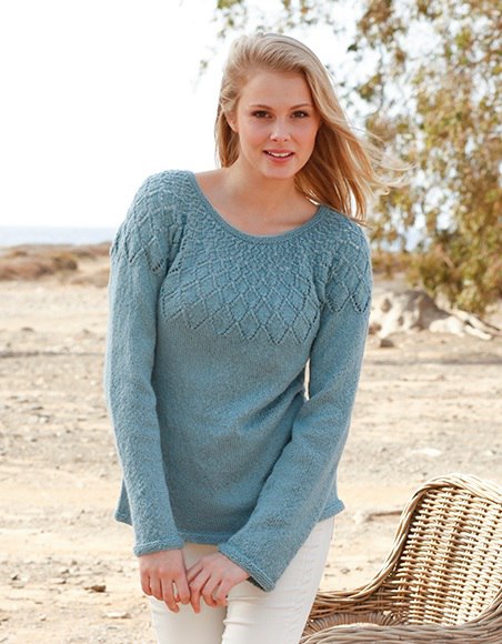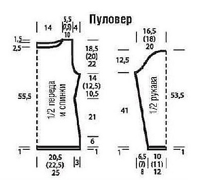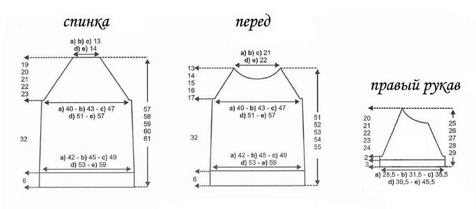 Сп. No3 набираем одной нитью 76; 84; 94; 104; 120п. и вяжем рез-ку 1л.х1и. на 3см. Переходим на сп. No3,5 и узор ажуром. На высоте 2см от рез-ки формируем реглан, закрывая с каждой стороны 1 раз по 3п., затем: