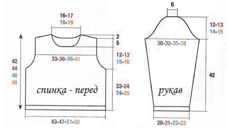 Вязать, пользуясь описанием спинки, с выполнением по центру панно с косами. На высоте 32см (102р.) от рез-ки формируем реглан, закрывая с каждой стороны 1 раз по 3п. Затем: