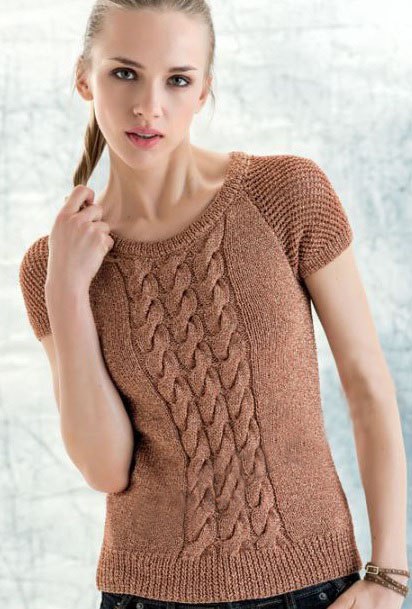 Этот стильный джемпер, связанный из тонкой пряжи, украшают три большие вертикальные косы. Модель просчитана на размеры: 34-36; 38-40; 42-44; 46-48; 50-52.