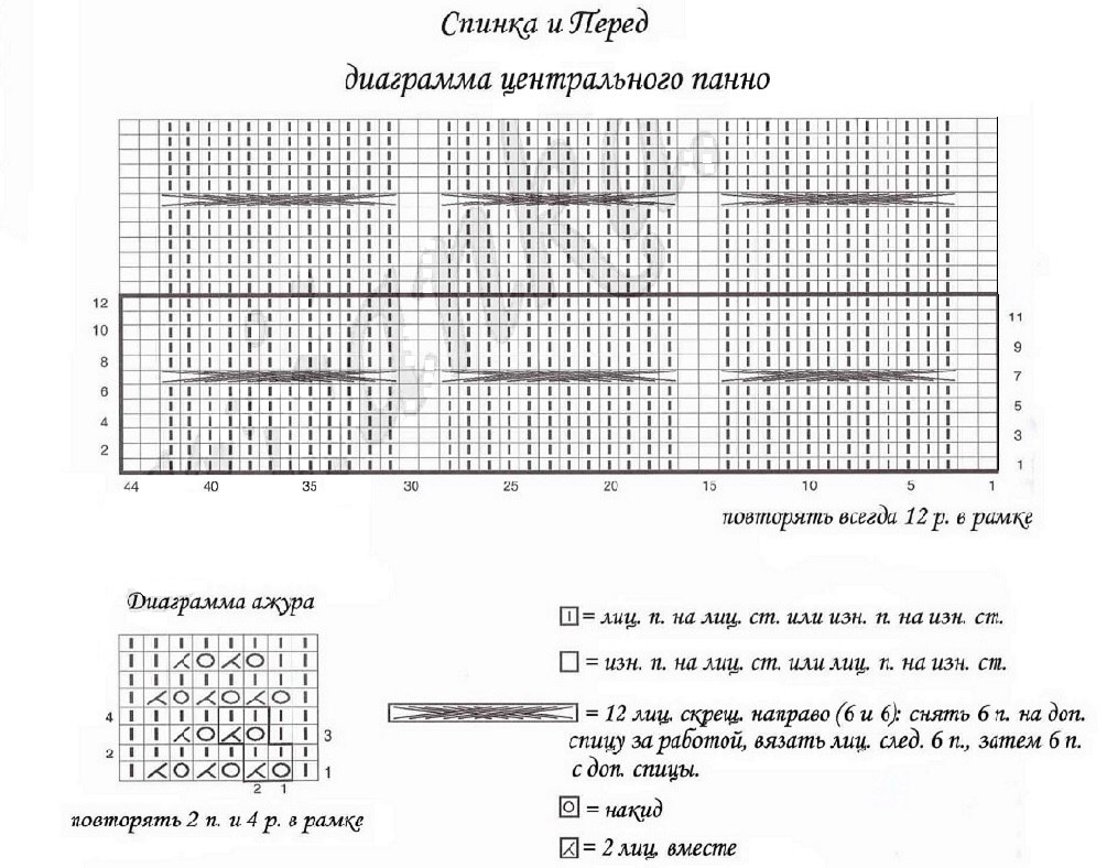 Плотность: на лиц. гл. в две нити спицами No4,5 20п. на 32р. равны 10см на 10см; на ажуре в одну нить сп. No3,5 26п. на 48р. равны 10см на 10см; 44п. центрального панно косами спинки и переда в две нити сп. No4,5 равны 13см.