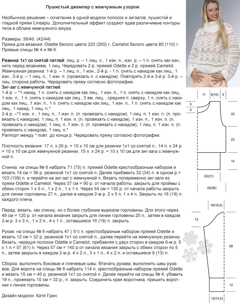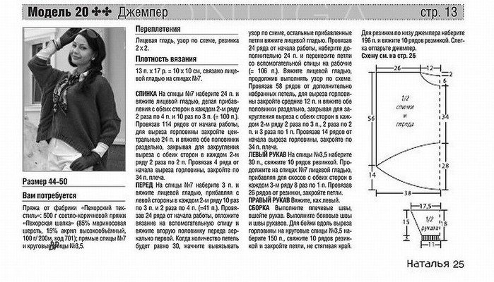 Плотность: лицев. гладью 27п. на 36р. равны 10см на 10см; жаккардовым узором 27п. на 31р. равны 10см на 10см.