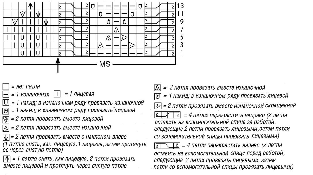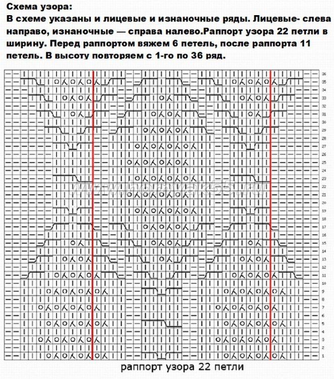 - прибавления на рукавах: выполняем в нижней части рукава, не довязывая 1п. до М. Делаем 1н., 1л., М, 1л., 1н. В след. р. накиды вяжем лицев. скрещенными;
