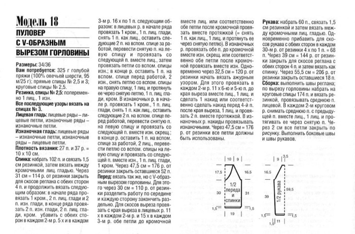 По этой схеме вяжем джемпер 8см, затем убавляем по 1п. с обеих сторон от М. В ряду – минус 4п. Повторяем убавления каждые 4,5см всего 7 раз для всех размеров. Получается 184; 200; 220; 240; 264; 288п.