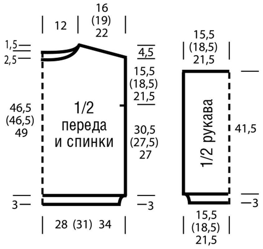 Продолжаем лицев. гладью. На общей высоте рукава 10; 7; 7; 10; 7; 7см прибавляем 2п. возле М (см. описание выше). Повторяем добавления с интервалом 3; 2,5; 2; 1,5; 1,5; 1,5см всего 12; 15; 18; 19; 20; 21 раз. Получаем всего 68; 76; 84; 88; 92; 96п. Через 46; 45; 43; 42; 40; 39см закрываем центральные 8; 8; 10; 10; 12; 14п. в нижней части рукава. У нас 60; 68; 74; 78; 80; 82п. Откладываем связанный рукав и вывязываем второй аналогично.