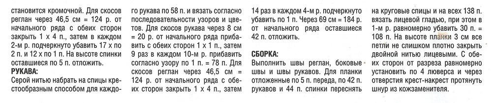 Делаем 5; 5; 6; 6; 6; 7 убавок в каждом 4-ом р., затем 14; 16; 18; 21; 23; 24 убавки в кажд. 2-ом р. Всего 19; 21; 24; 27; 29; 31 убавка. Остается 136; 152; 156; 160; 168; 176п. Провязываем 2р. платочного рис-ка. В первом из рядков 22; 26; 26; 24; 22; 20 петелек рукавов провязываем попарно лицевыми. Еще в этом же ряду дополнительно убавляем через равные промежутки 18; 28; 26; 28; 34; 40п. Остается 96; 98; 104; 108; 112; 116п. Закр. п. Зашиваем подрезы рукавов.