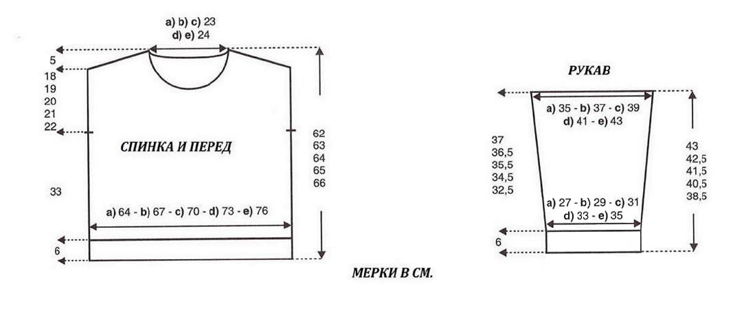 Через 39см (для всех р-ров) закрываем по 8; 8; 10; 10; 12; 14п. с обеих сторон: по 4; 4; 5; 5; 6; 7п. с каждой стороны от М. У нас остается по 84; 92; 100; 110; 120; 130п. на спинке и полочке. Откладываем эту деталь и начинаем работу над рукавами.