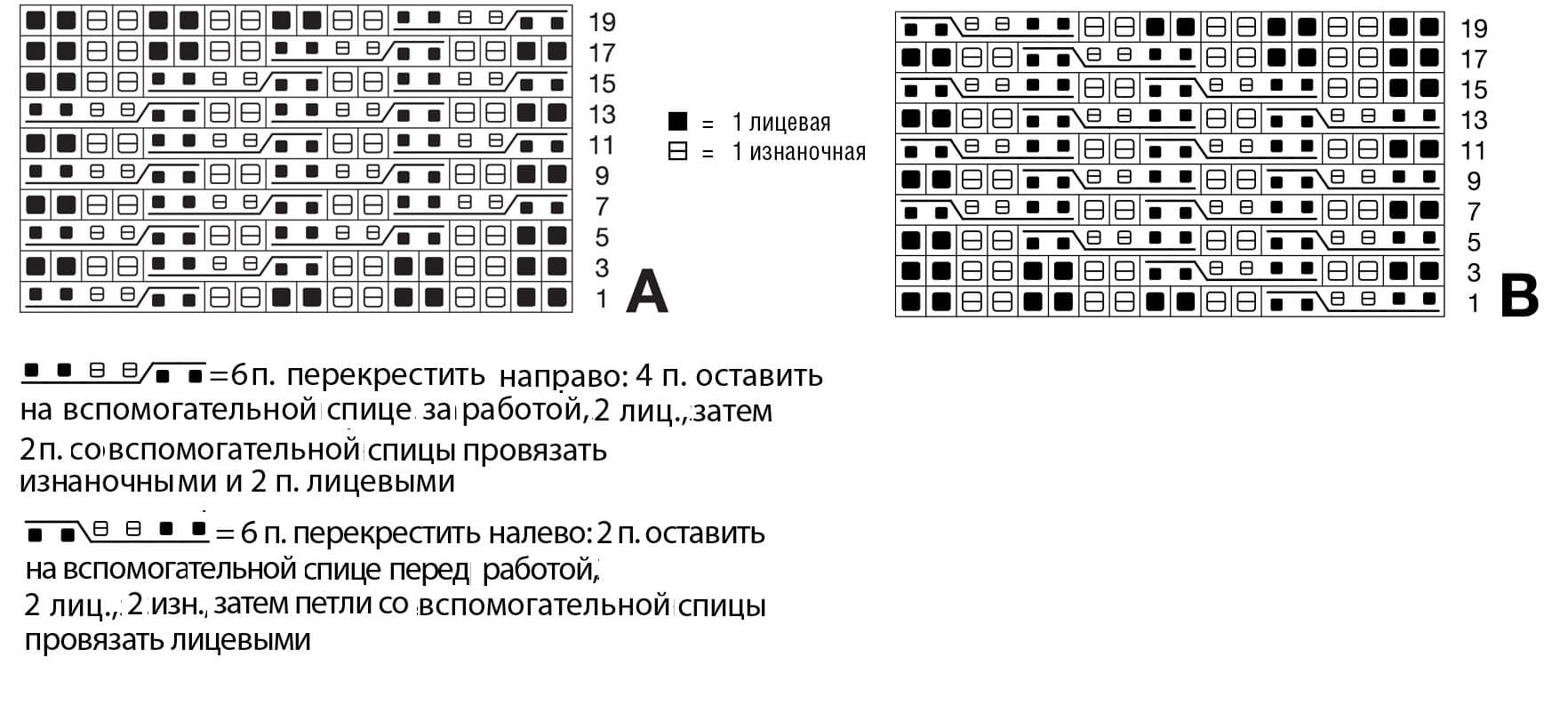 - косы (жгуты): выполняем по сх. А и В: петли распределяем по рекомендациям описания, вертикальный раппорт – с 1-го по 20-ый р.