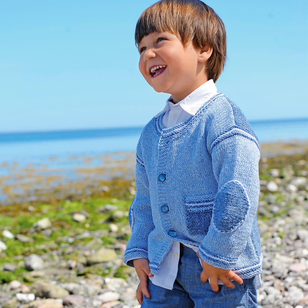 Жакет, выполненный из принтованной пряжи голубых оттенков, смотрится по-взрослому. Карманы, заплатки на рукавах – эти стильные детали наверняка понравятся вашему ребёнку.