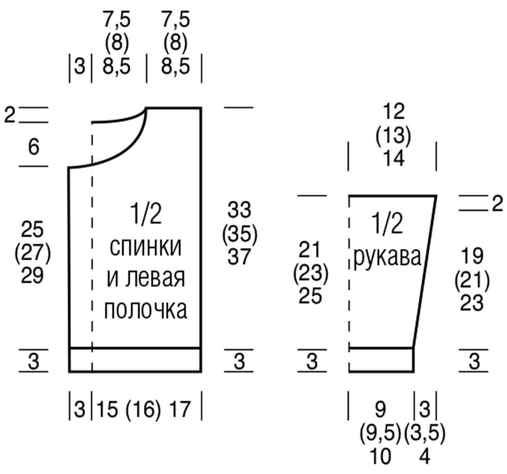 Выполнив 31; 33; 35 см гладью закрываем центральные 26; 28; 30 п. и каждую сторону заканчиваем отдельно. Для скругления горловины в чётных р. закрываем по линиям формирования выката один раз по 2 п. и один раз по 1 п.