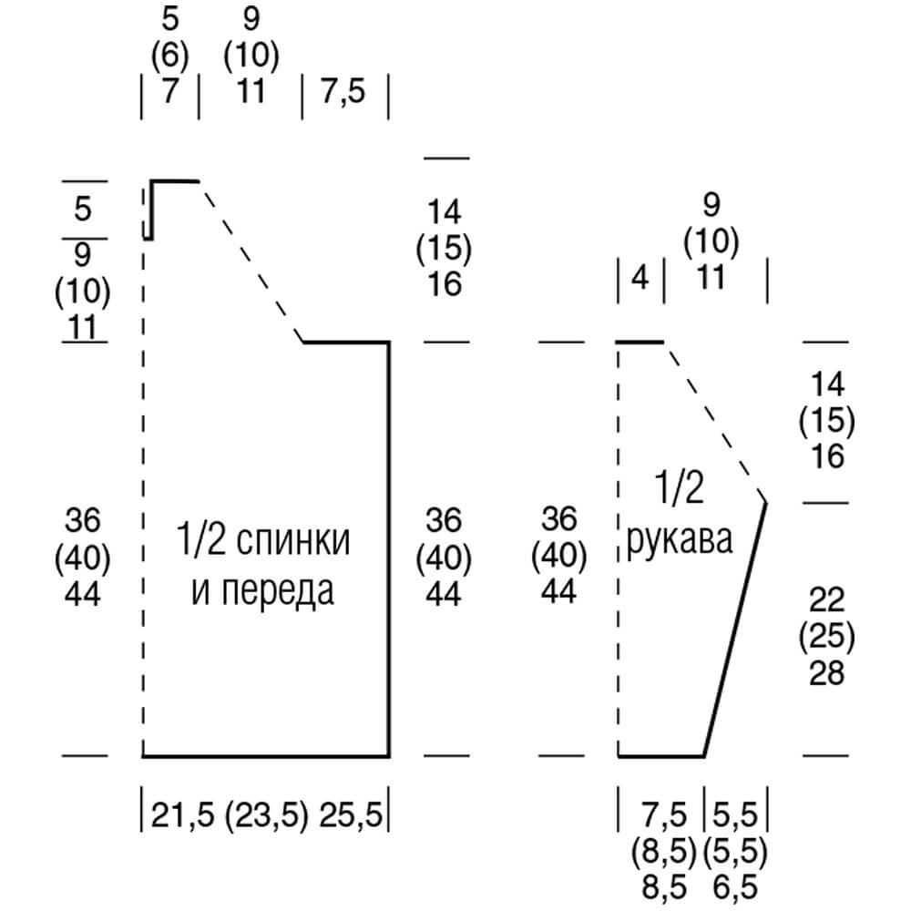 Одновременно для расширения рукава выполняем прибавки в каждом 6-ом ряду с двух сторон по узору 5; 9; 10 раз по 1 п. Затем в каждом 4-ом р. с двух сторон прибавляем по узору 8; 4; 5 раз по 1 п.