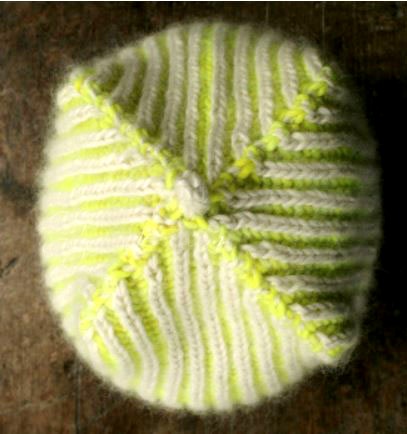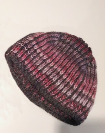 Далее будем вязать спицами No4 основной узор – двухцветную резинку бриошь. Выполнив 12-14см высоты шапочки, переходим на вязание прямыми спицами. Распределяем петельки на 4 спицы.