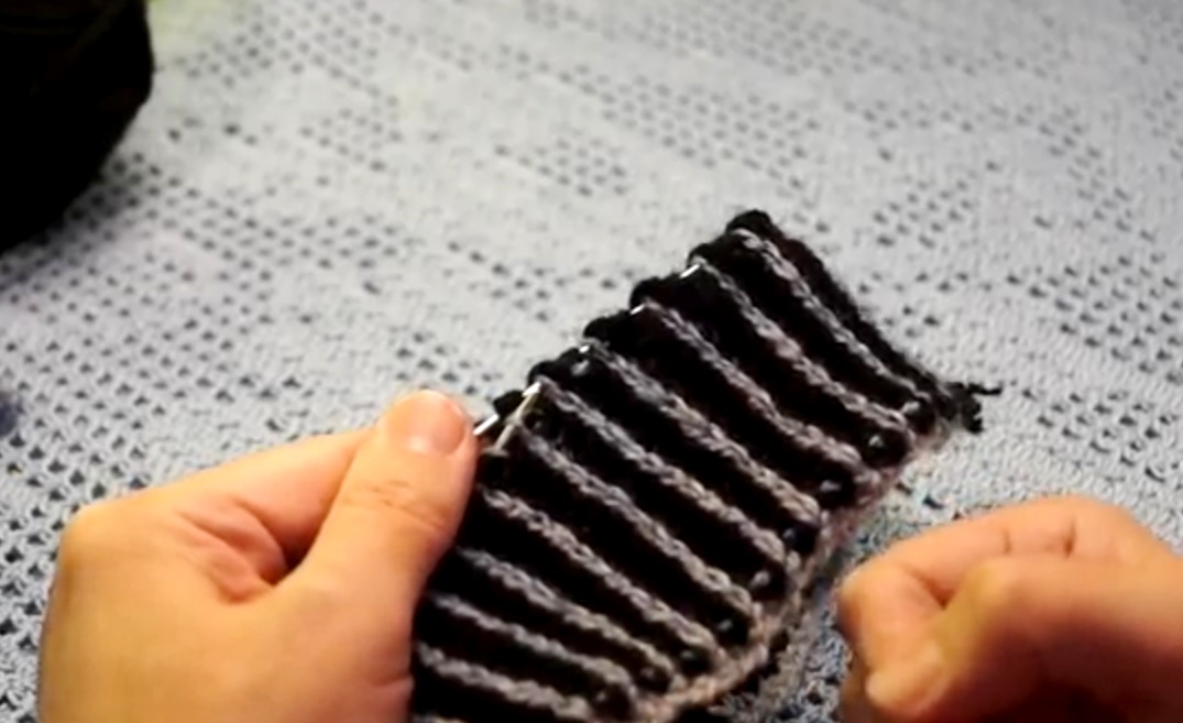 1р. (ДЦ): *снимаем 1 п. с н. (= переводим рабочую нить перед полотном, снимаем след-щую петлю как изнананочную; в это же время делаем накид на сп., возвращая рабочую нить за полотно), 1 лиц/п*, оставляем нить ДЦ за полотном;