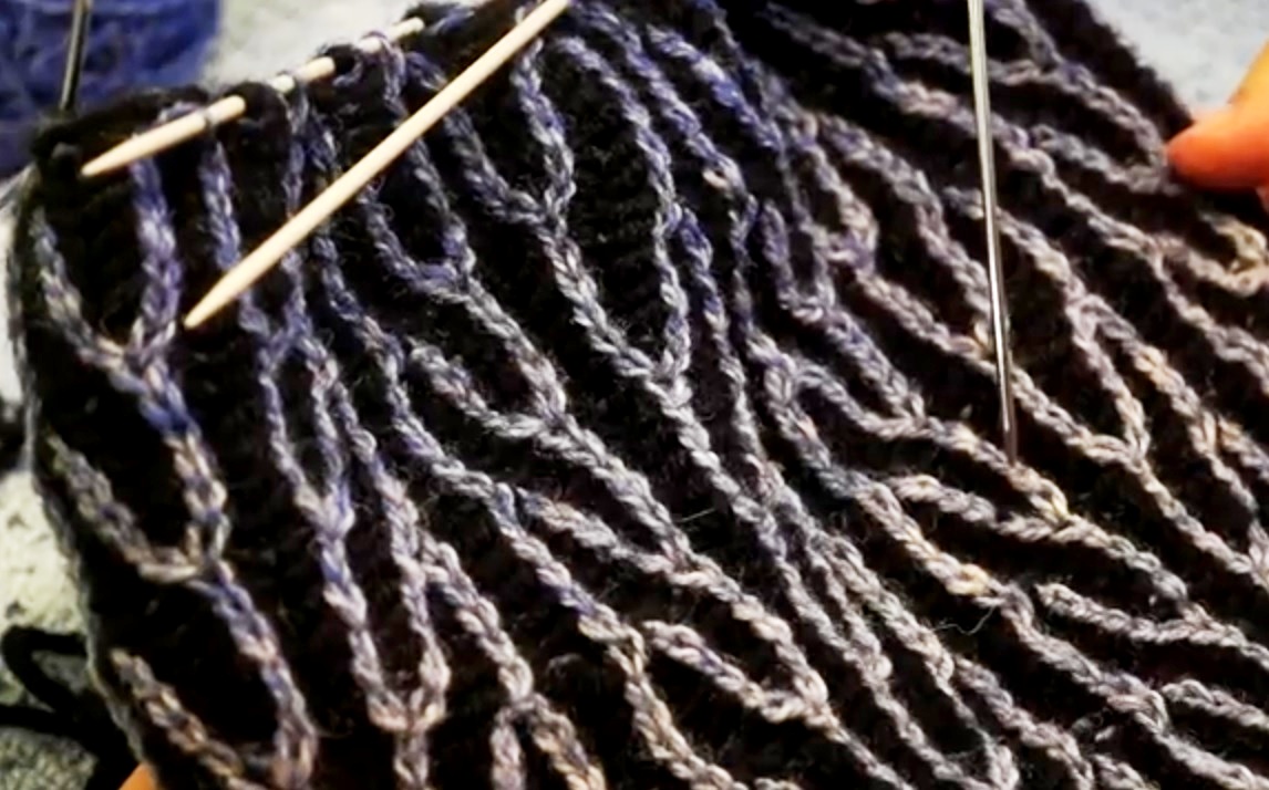 - 5р. (А): переходим на носочные спицы: *1 убавление (= 1 лиц. снимаем с н., 1 изн., протягиваем вывязанную п. через снятую; полученную п. возвращаем на левую сп., набрасываем на нее след-щую п. с н.), снимаем 1 изн.*;