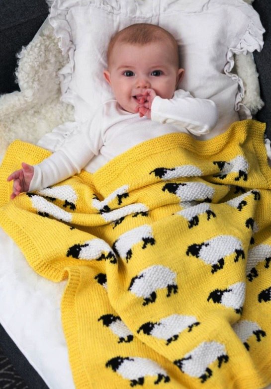 Вязание овечек выполняем со схемы. Обратите внимание, чтобы при перемене пряжи не было длинных протяжек на изнаночной стороне покрывала. Это некрасиво и, к тому же, в этих нитках могут застрять пальчики ребенка.