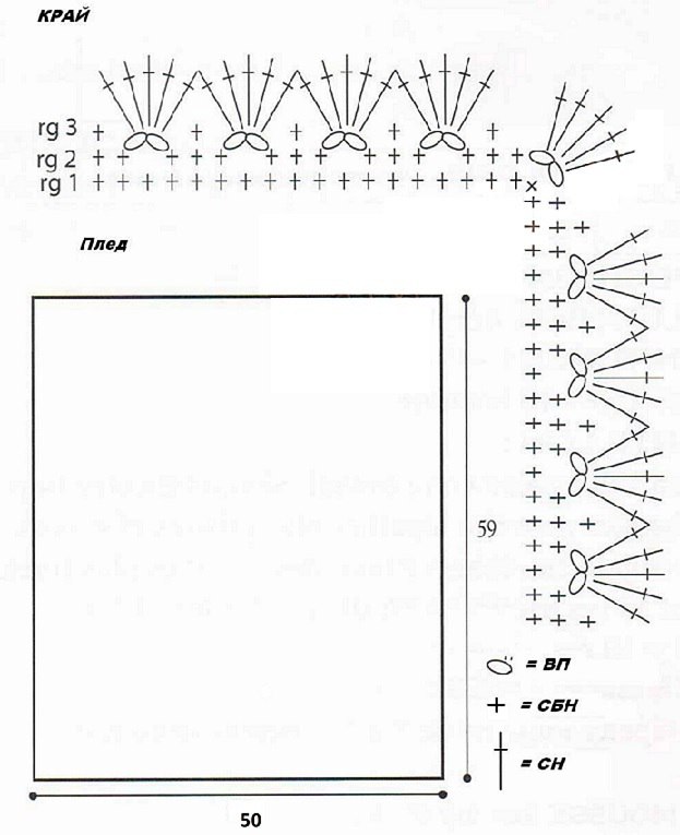 Обвязать крючком плед по периметру пряжей No1 одним р. ПБН (СС) и далее выполнить 3р. по схеме.