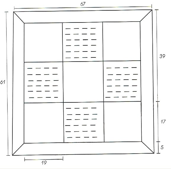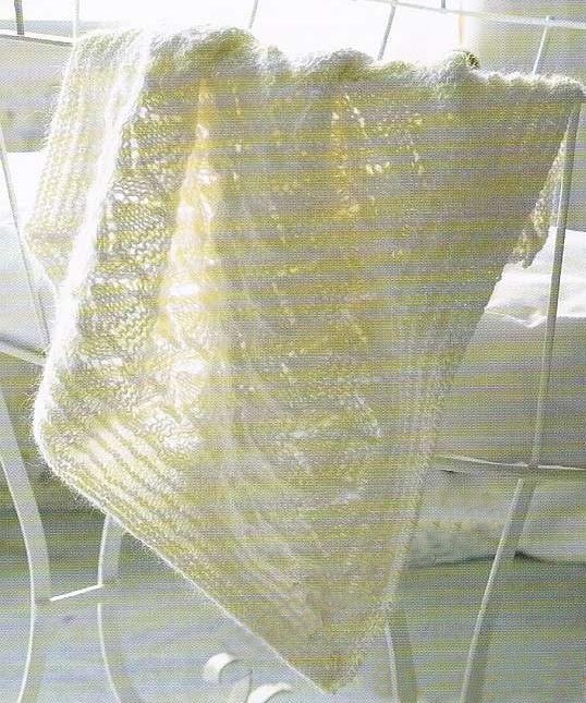 Вязать 7 раз по 16р. мотива, затем 1 раз первые 8 р. и начинать край. Вязать 16р. чередуя узоры: 2р. платочной вязки и 2р. лиц. глади, затем 5р. платочной вязки. В то же самое время, сделать с обеих сторон за 2п. от края (п. связанные лиц. гладь), 10 раз по 1 прибавлению в каждом 2 р. Закрыть полученные 103п. лицевыми. Набрать 83 п. на каждой из 3 других сторон и вязать такой же край. Соединить края уголков.