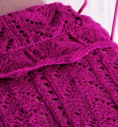 23р.: 9л., 2п. в 1л., * 1и., 1н., 1и., 1н., 1и., 1 двойная протяжка* от * и до * до крайних 14п., 1и., 1н., 1и., 1н., 1и., 1 протяжка, 9л.