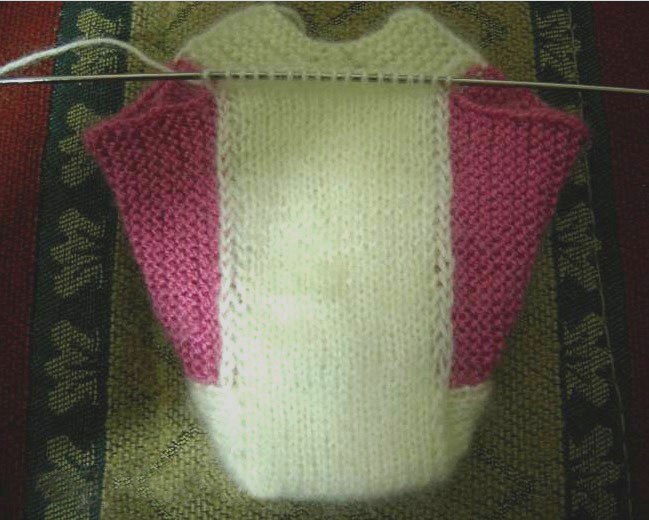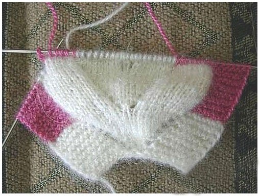 Продолжаем, выполнив 5р. белой пряжей лицев. гл. Одновременно убавляем по 1п. на 2-ой и 4-ой сп. Итого – 70п. Продолжаем работу только на 1-ой и 4-ой сп., вывязывая подъем пятки. Делаем прямые и обратные ряды, в 1-ом изнаночн. р. вывязывая изн. п., убавляем через равные промежутки 3п. В работе 32п. След. р.: 2л., *снимаем 1п., нить за полотном, 1л.* – от * и до * повторяем до конца р. По такой схеме вяжем все лицевые рядки, а изнаночн. рядки вяжем изнаночными. Провязываем всего 34р. и потом еще 1р.