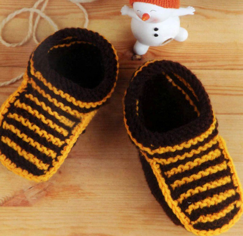 Простая модель, доступная для начинающих мастериц, вывязывается быстро и очень эффектно выглядит за счет контрастных полосок. Такие тапочки с успехом заменят ребенку носки.