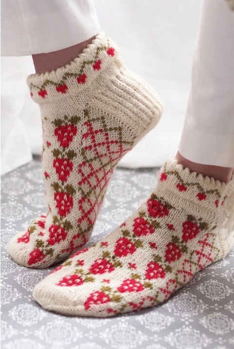 На высоте 19см от первой убавки в пятке начинаем в 17р. убавки для оформления мыска – см. схема. Продолжаем убавки, закончив вывязывание клубнички в 24р. Закончить вязку мыска белой пряжей: